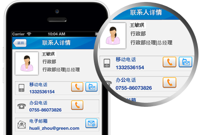 实时获取企业组织和人员信息,实现快捷方便的跨组织和跨部门人员信息查询和获取,支持企业用户即时电话、短信、邮件沟通,提高企业通讯录查询和通讯的便捷性。